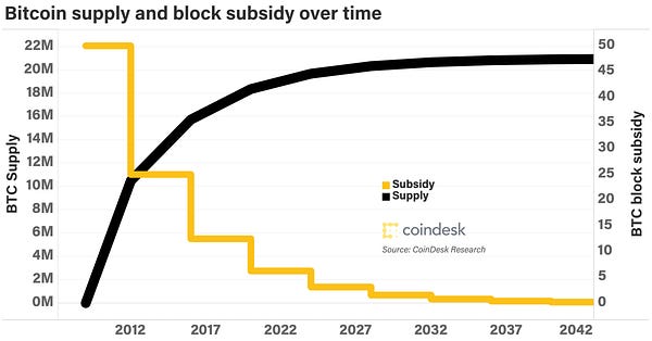 Bitcoin is digitally scarce. In a time when it’s tough to come across factual information, it is reassuring to be able to reference the Bitcoin block explorer for truth. How many other protocols online share that characteristic? According to Bitcoin’s white paper, 21 million Bitcoin will ever be produced. To date, already 18.375 million have already been mined. The supply schedule is hard-coded into the protocol making it impossible to change, although some may try in the future. The distribution is simple, every block (~10 minutes) a miner is rewarded in Bitcoin from the coinbase (not the company Coinbase). At the very beginning this reward was 50 Bitcoin per block. Now almost 12 years later that reward changed for the third time in history to 6.125 Bitcoin per block. Every 210,000 blocks (~4 years), the amount of Bitcoin given per block is cut in half until it reaches its max supply of 21 million. This gives reason to believe Bitcoin can be a macro hedge to global inflation and “QE Infinity”.